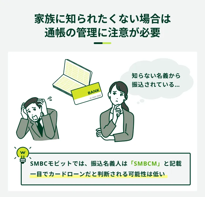 振込融資は、パソコンやスマホからの手続きで借入ができるため便利ですが、通帳に明細が残ります。そのため、家族に通帳を見られるとカードローンの利用が知られてしまう可能性があります。口座振替で返済する場合も同様です。